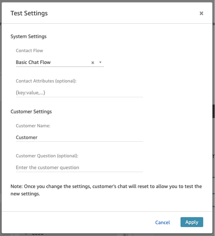 2. Choose Test Settings. Under System Settings, choose under the Contact Flow dropdown, select Basic Chat Flow that was imported in an earlier step.