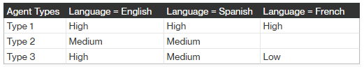 Context: Continuing with our Mortgage and Credit Card examples, consider a team of English, Spanish and French skilled agents who need to be staffed, as classified in TABLE 2 below:
