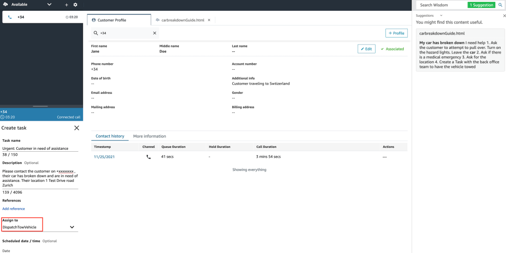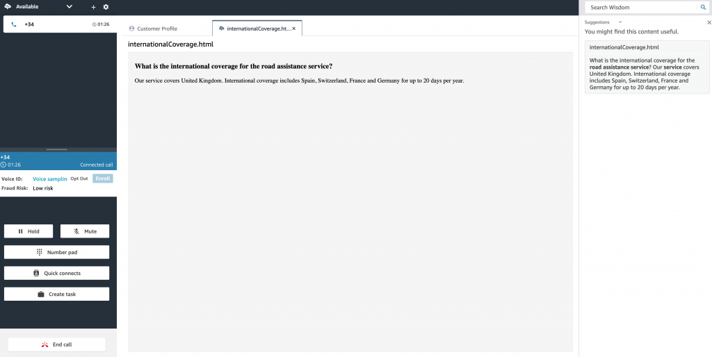 - Continue the call and ask the caller the reason for the call. The caller could reply with a message similar to “I am trying to find out if you provide Road Assistance service for Switzerland”. As the caller and the Agent are speaking, Amazon Connect Wisdom comes up with a suggestion to the Agent