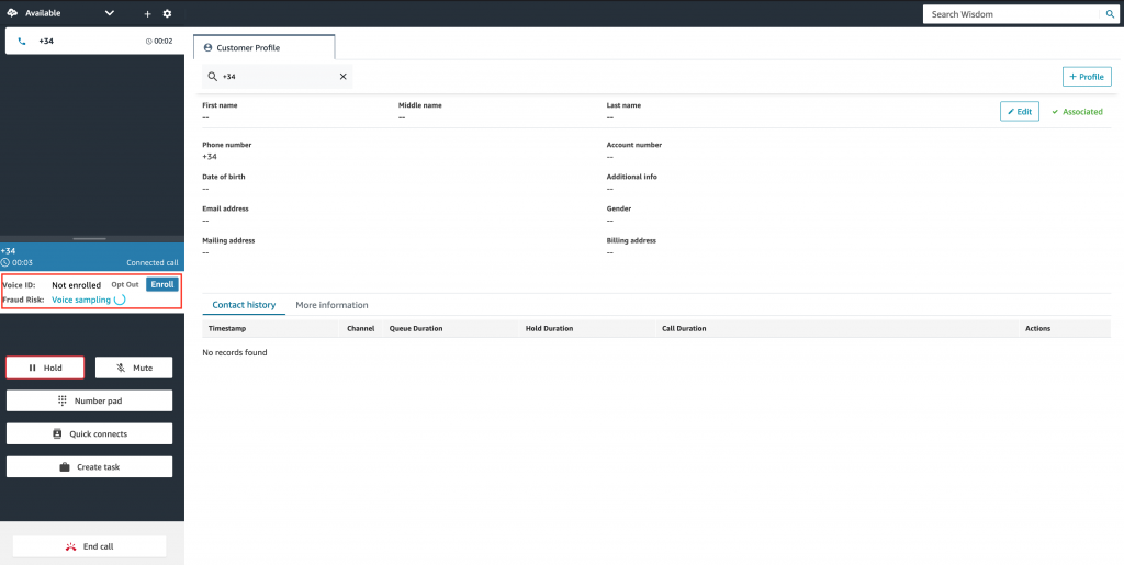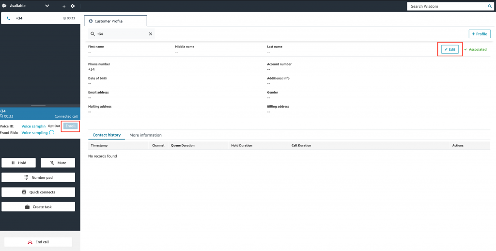 - While Voice ID is gathering the voice sample, click on Edit in the Customer Profiles Tab