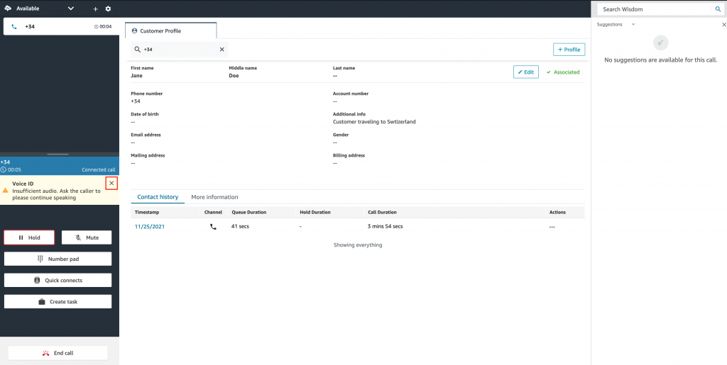 By completing this first call, we have demonstrated how Amazon Connect Wisdom has provided suitable recommendations to the agent regarding the customer’s query, and the process of setting up both Amazon Connect Voice ID voice authentication, and Amazon Connect Customer Profiles for storing customer’s data and contact history.