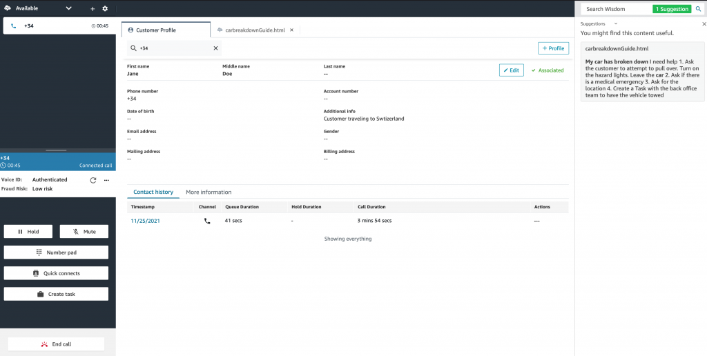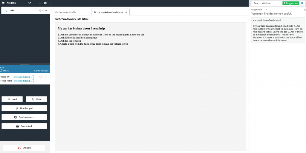 In our second call, the customer is requesting emergency road assistance, due to a car breakdown on their journey abroad. Amazon Connect agent application is designed to automatically present customer data and contact history from Customer Profiles, as well as a status of the voice authentication with Voice ID. Based on the customer request, Wisdom will display suitable knowledge articles to guide the agent through the best course of action so they can help the customer as quickly as possible