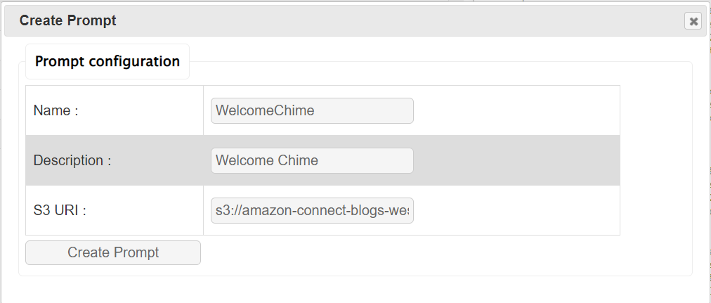 - Enter the Amazon S3 URI for the prompt (Amazon S3 Location from where the prompt should be imported into the Amazon Connect instance)