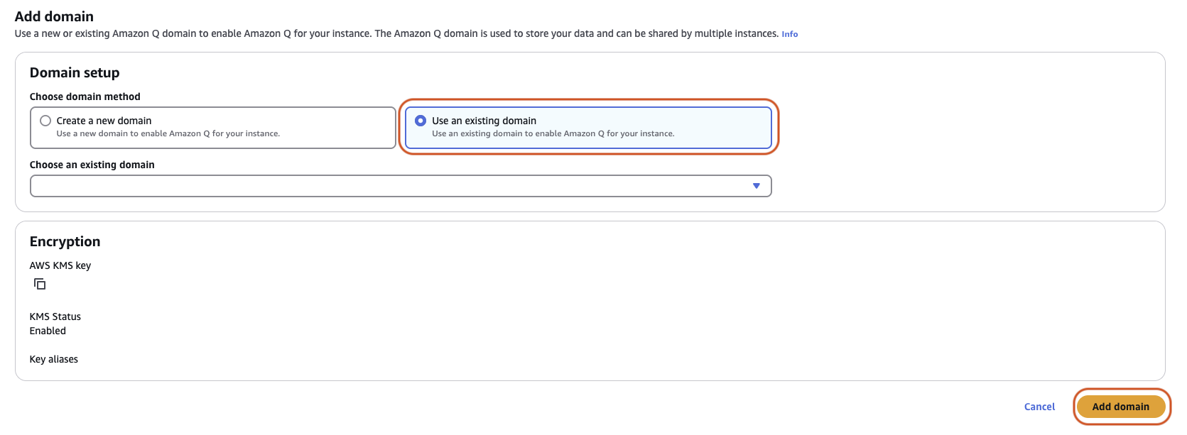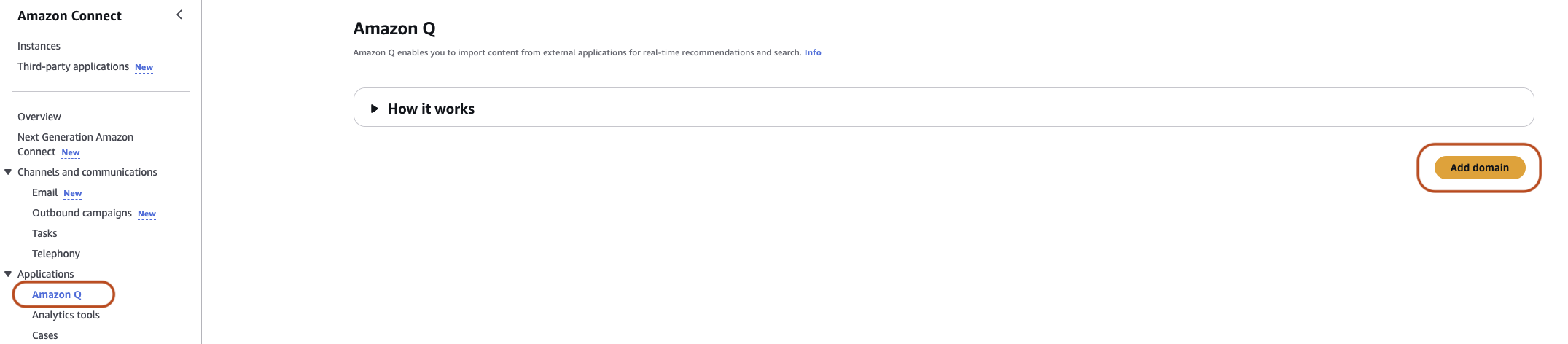 - In the Amazon Connect Console, navigate to Amazon Q, and click on Add Domain: