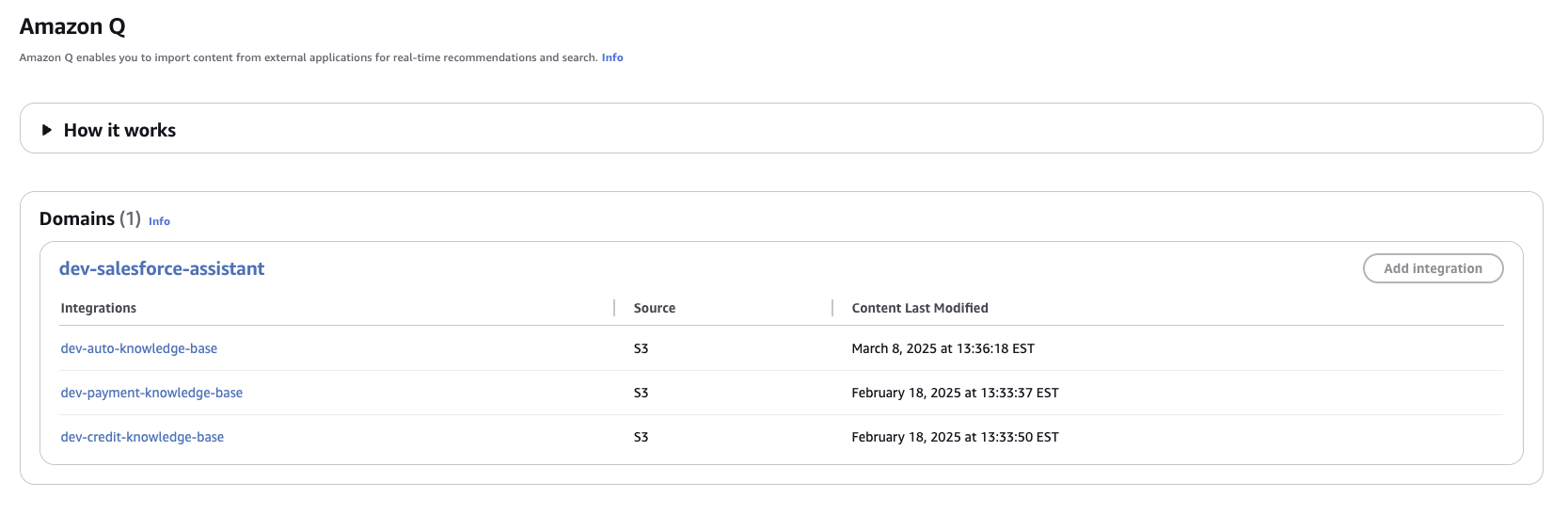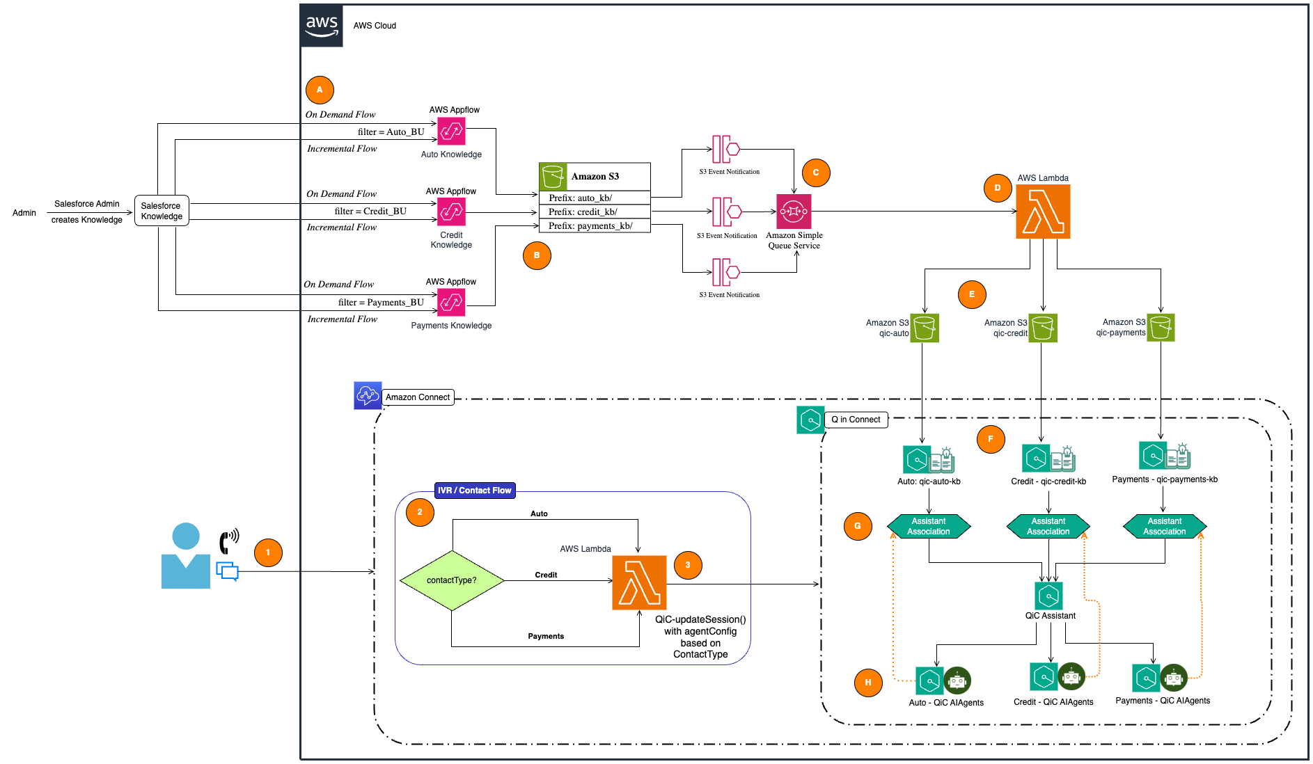 This post will guide you through the process of enhancing your customer support infrastructure using Amazon Q in Connect and Salesforce Knowledge. We’ll start by exploring the solution architecture, showing you how to seamlessly integrate Salesforce Knowledge with Amazon Q in Connect. You’ll learn how to define multiple LOB-specific knowledge bases and associate them with custom AI Agents and AI prompts, tailoring your knowledge management to each distinct area of your business.