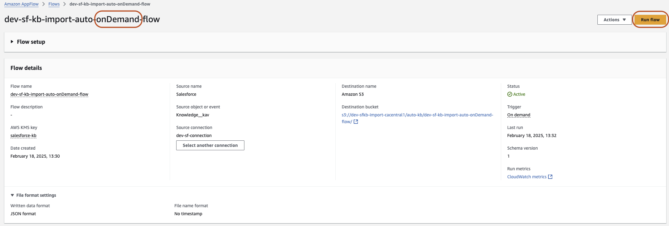 From Step 1 above, copy the connection name that was created and update the following configuration:{ "connection_name": "dev-sf-connection", // Replace with your AppFlow connection name "object_name": "Knowledge__kav", } - Knowledge Article Fields