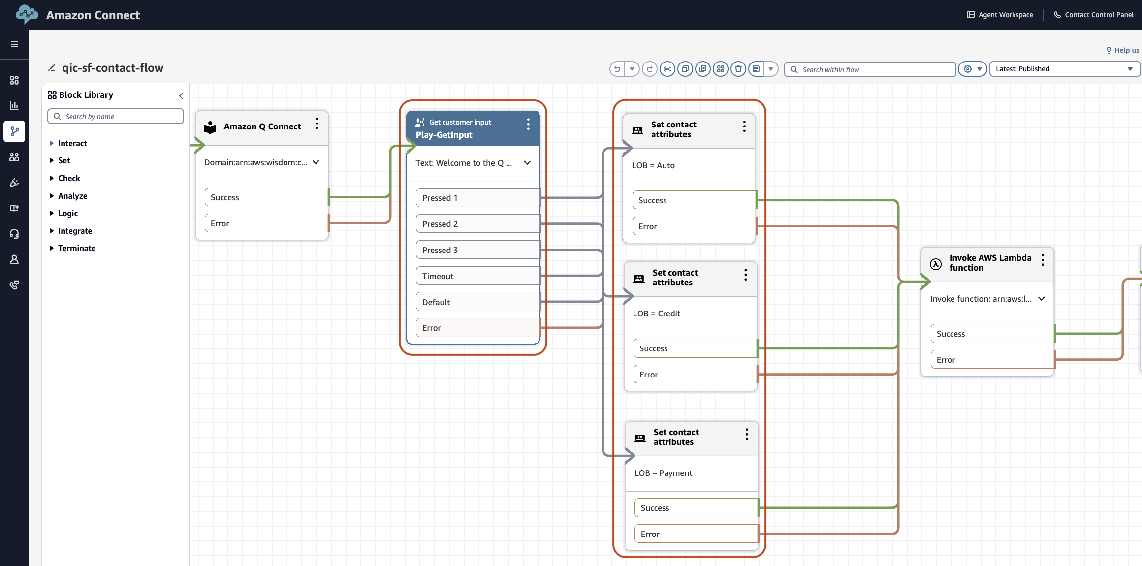 - Update the Set contact attributes block for each options. The LOB attribute is mandatory, and the value should be the same as the ones provided in the CDK configuration at the time of deployment