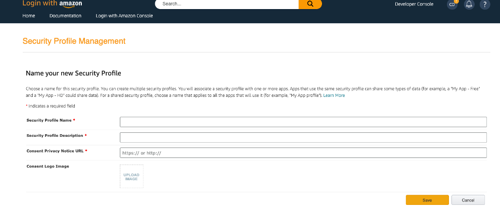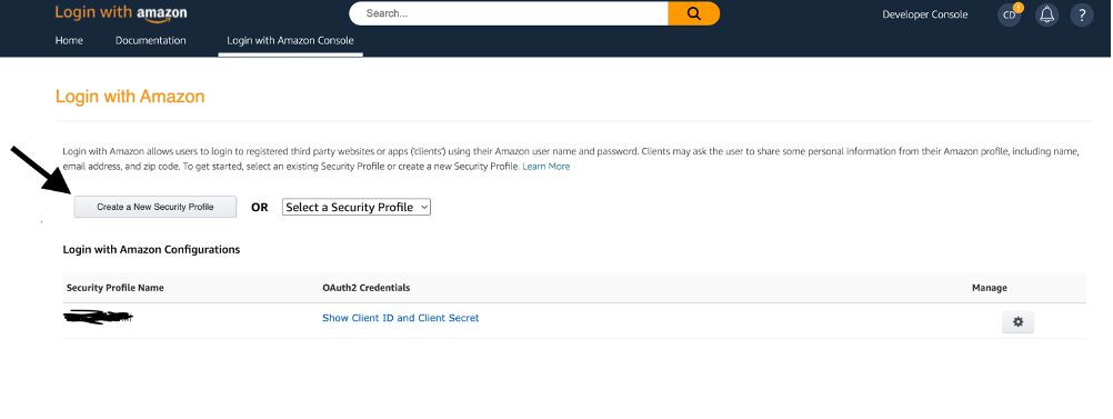 - Sign into your Alexa developer Login with Amazon (LWA) console and create a LWA Security Profile.