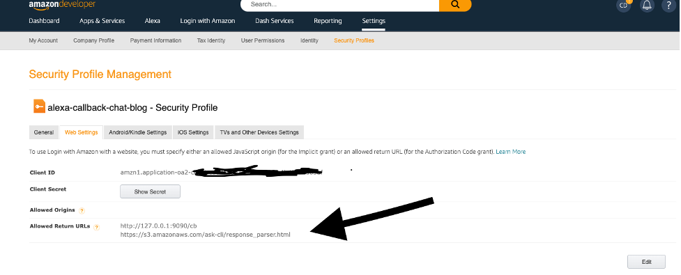 - Click on Edit, add http://127.0.0.1:9090/cb and https://s3.amazonaws.com/ask-cli/response_parser.html in the Allowed Return URLs field and make note of the Client ID and Client Secret: