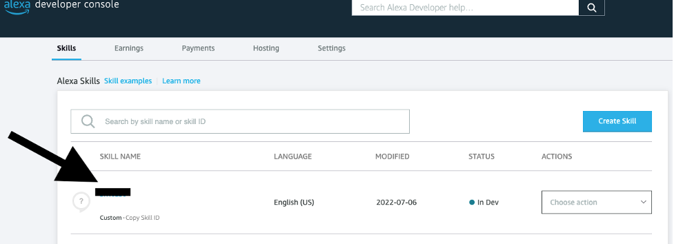 - In the Skills tab, you should see your deployed skill. Click on the skill. This will take you to the Build tab.