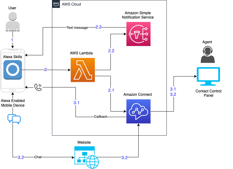 In this post, we have implemented a solution for Alexa device users to request to speak or chat with a contact center agent. The solution consists of Amazon Connect contact flows, Alexa custom skill and AWS Lambda endpoint. We used AWS CDK to deploy the Alexa custom skill and AWS Lambda endpoint.