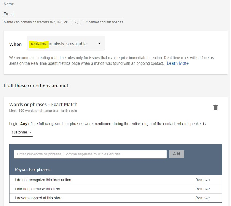 - Create a rule for Contact Lens real time analysis. For the purpose of this blog post, please enter rule name exactly as defined- Fraud. Your rule may contain key phrases such as ‘I do not recognize this transaction’, ‘I did not purchase this item’, or ‘I never shopped at this store’. Please ensure that the rule type you create is for real-time analysis. Feel free to add any other phrases, keywords, or conditions as you see fit.