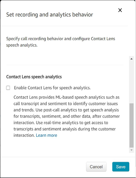 To avoid incurring future charges, you can turn off Contact Lens processing by disabling the “Contact Lens speech analytics” option in the Set recording and analytics behavior block in the contact-lens-real-time-blog-CLRT-Contact-Flow contact flow.