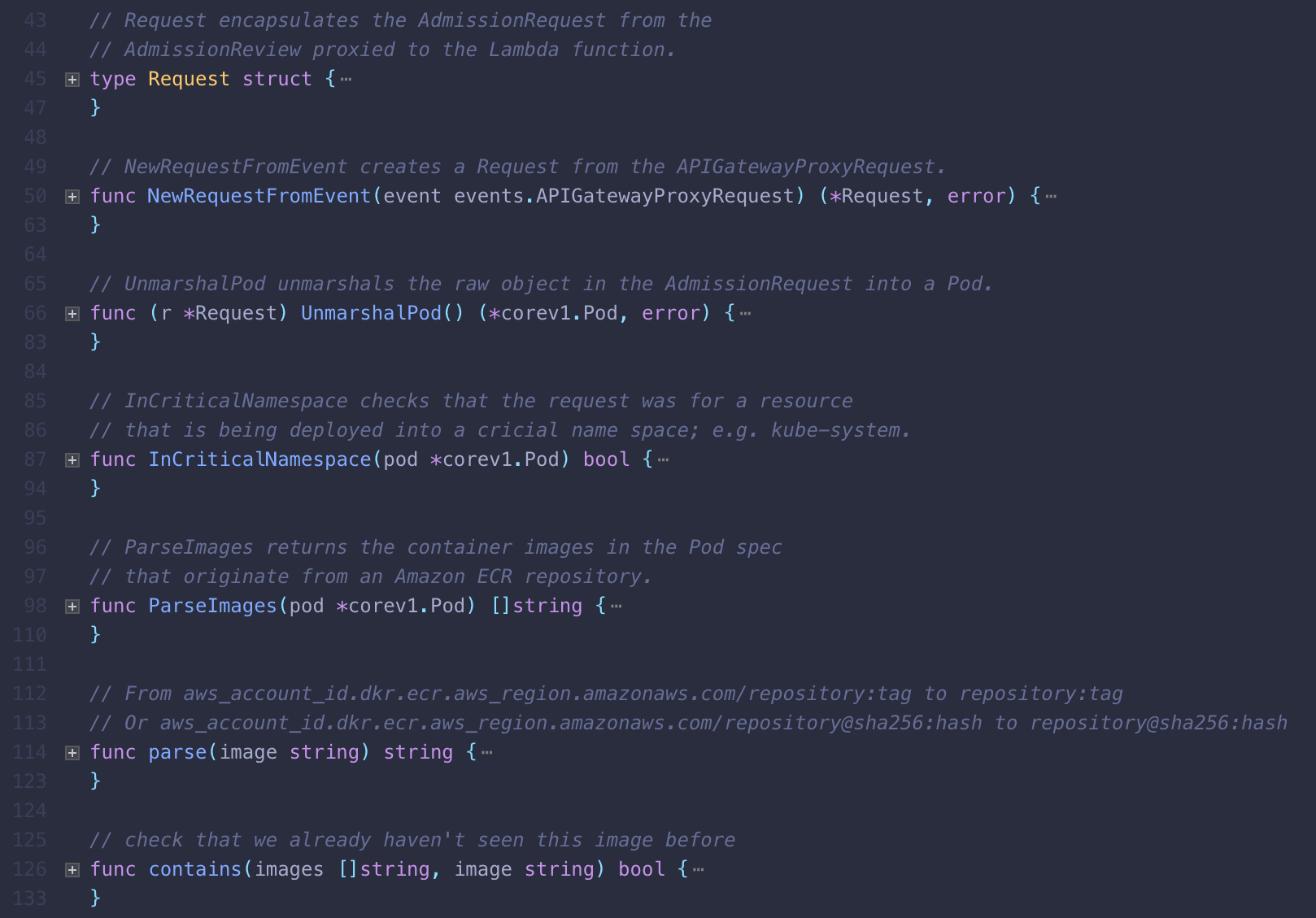 Before we detail the handler for the Lambda function, we’ll take a look at the main components that drive its business logic. We split up the logic into two Go packages. First, pkg/webhook contains methods and types that assist in extracting pod information. Second, pkg/function will process the pod’s contents for compliance and define the handler for the Lambda function.