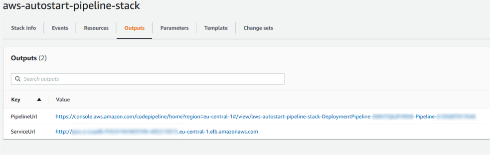 Once the stack creation process is finished, click on the Outputs tab to see the load balancer’s ServiceUrl to access your testing environment.