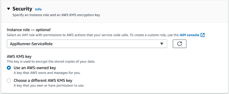 - In the Security section, attach the instance role that was created earlier AppRunner-ServiceRole