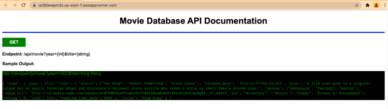 To test the GET method, copy the App Runner Default domain and add the path /api/movie and pass a value to the query arguments “year” and “title.” You can use a standard browser like Firefox or Chrome to test the GET method.