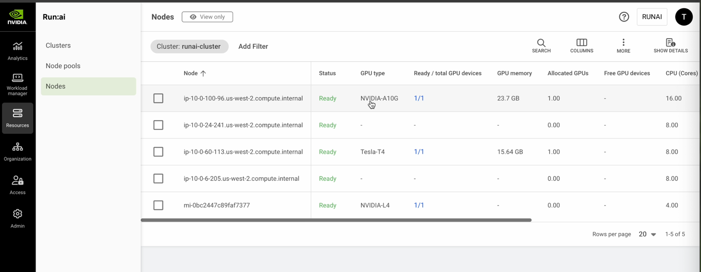 Figure 3: Sample Run:ai console showcasing available nodes within cluster named “runai-cluster”