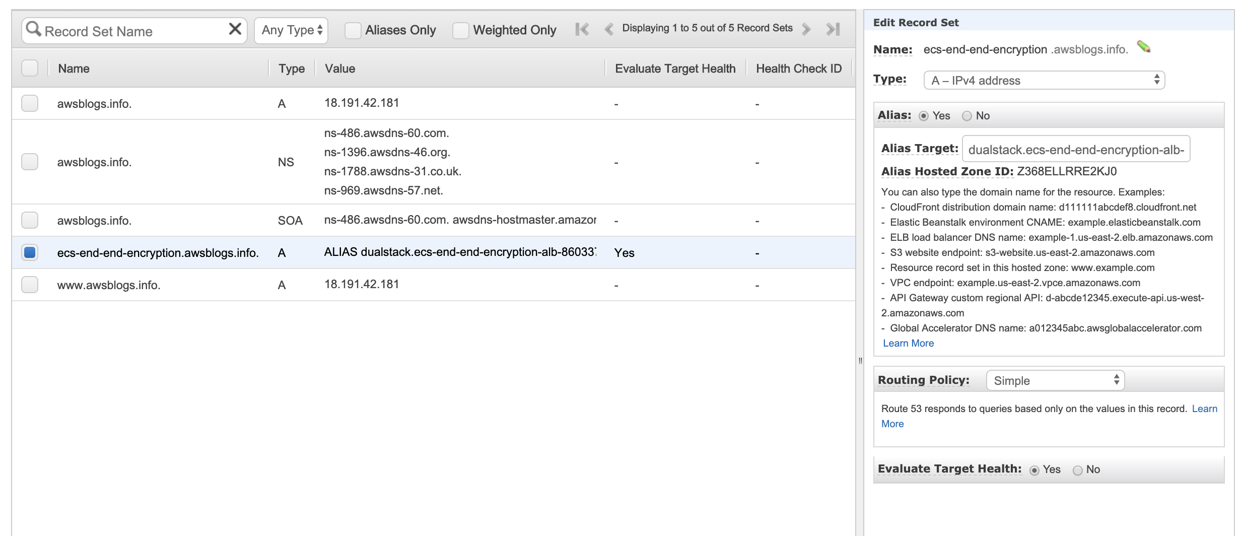 Let’s now setup a Route 53 record set on the domain I host on Route 53. I have created a hosted zone. I will create and point a record set to the ALB I created earlier. I have setup the Common Name (CN) on the cert with this domain [ CN= ecs-end-end-encryption.awsblogs.info ]