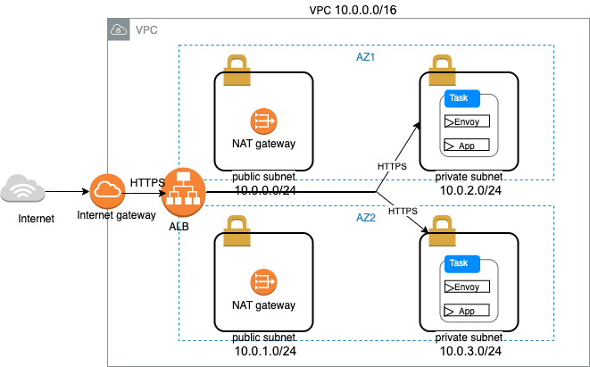 We will also use Envoy as a front proxy that terminates TLS and we will run Envoy as a sidecar along with the application container. With this method, we do not need to handle encryption in the application code. Envoy will send traffic, unencrypted, to the application container over localhost.