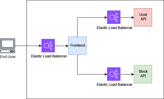 The following diagram depicts the sample application before implementing a service mesh. It consists of a Frontend service and two backend APIs: User and Stock. The three services are deployed on Amazon ECS as long-running services comprising one or more Tasks. An Elastic Load Balancer provides resilience and distributes traffic across the Tasks for each service in the architecture.