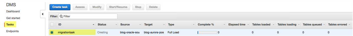 In this section, you use AWS DMS to do bulk loading from Oracle to Amazon Aurora PostgreSQL. AWS DMS now offers free use for 6 months per instance if you’re migrating to Amazon Aurora, Amazon Redshift, or Amazon DynamoDB.