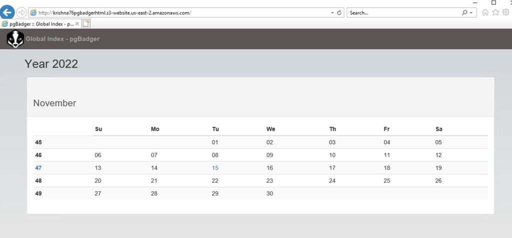 With that url you can make a browser request from an instance inside the Amazon VPC just created and you will see the reports interface for pgBadger, as in the screenshot below.