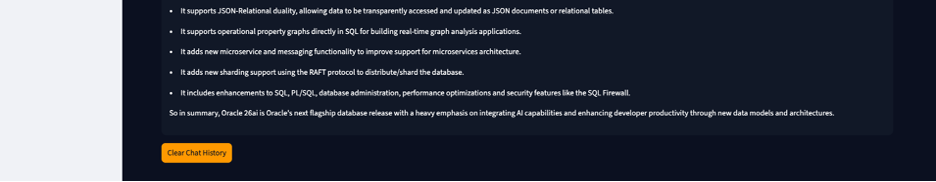 Developers can work with both relational and vector data within a single environment using standard SQL, reducing the learning curve and streamlining application development. It allows vector operations using PL/SQL packages. By integrating vector capabilities into a general-purpose database, Oracle AI Database 26ai uses existing enterprise-grade features like security, high availability (such as RAC), partitioning, sharding, and disaster recovery.
