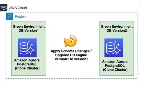 - Apply schema changes like adding indexes or data reorganization and major version or minor version upgrades on the Aurora clone cluster in the green environment.
