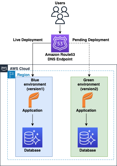 The desired change is applied on the green database environment only. When testing is complete on the green environment, live application traffic is directed to the green environment and the blue environment is deprecated. In addition, if something unexpected happens with your new version on the green environment, you can immediately roll back to the last version by switching back to the blue environment.