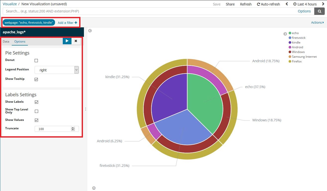 Marketing – People in marketing might want to know if users accessing the application through a particular OS or browser are more probable to view a particular product. They might use this data to publish ads on some other websites based on the criteria that is uncovered. Kibana can display a nested pie chart, where the inner-most rings are the webpage, and each webpage is subdivided into OS and then browser. This lets the marketing team see which products are popular for which OS and browser.