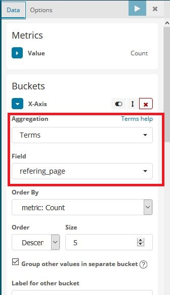 6. Under Buckets, for X-Axis, select Aggregation as Terms, select refering_page as the Field.