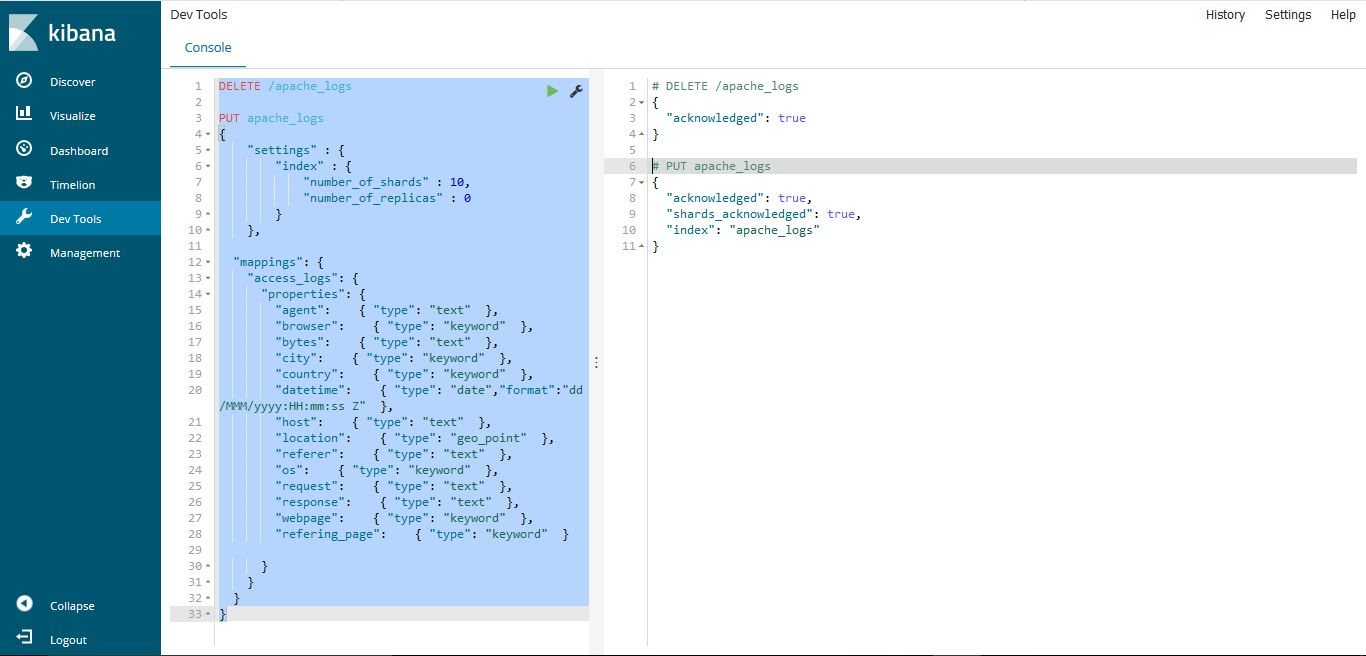 • This step deletes the apache_logs index if it has already been created.