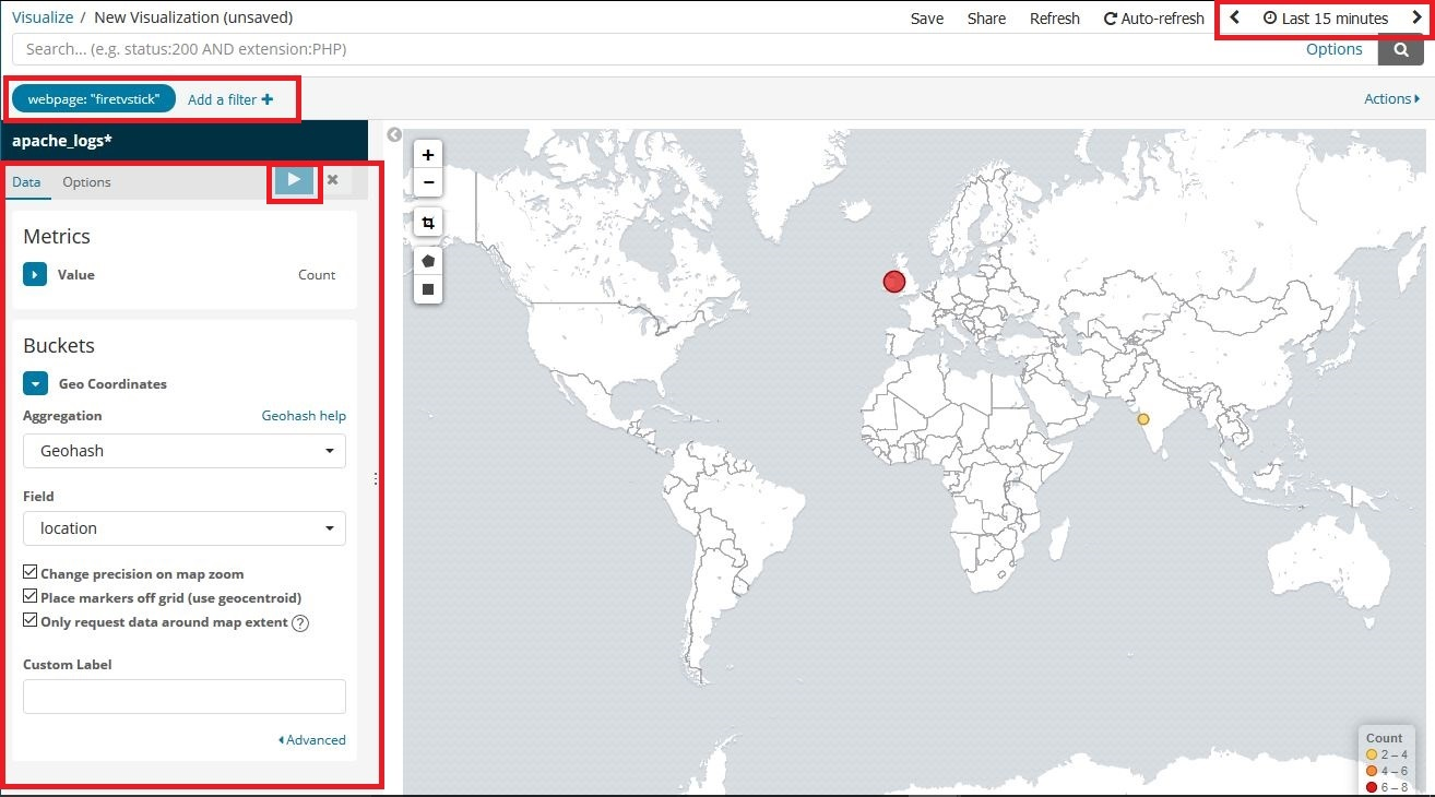 Sales Team – The sales team might need to know if people from a particular location are more interested in a particular product. Amazon ES is able to display the events from the log lines on an adjustable map, based on the value of the location field. Recall that in the transformation Lambda function we used GeoIP to add that information to each log line. The sales team can use the location field from the Apache web logs to determine the geographical regions that show the largest interest. By using the search features of Elasticsearch, they can even narrow the traffic displayed, based on the URL (details page) they’re looking at.