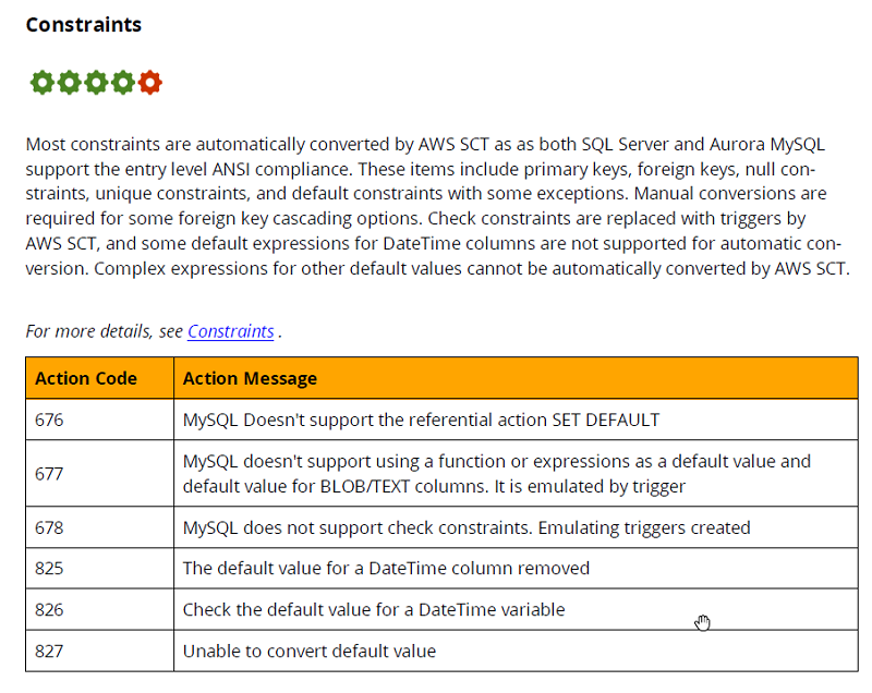 The following image shows AWS SCT action codes for converting constraints, from page 39.