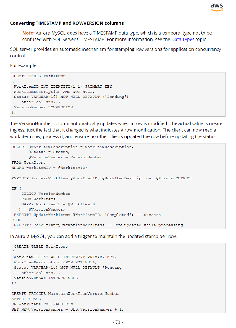 Syntax reference and code examples are also provided, where relevant. For example, if your databases are using either TIMESTAMP or ROWVERSION columns, you can work with the following migration example.