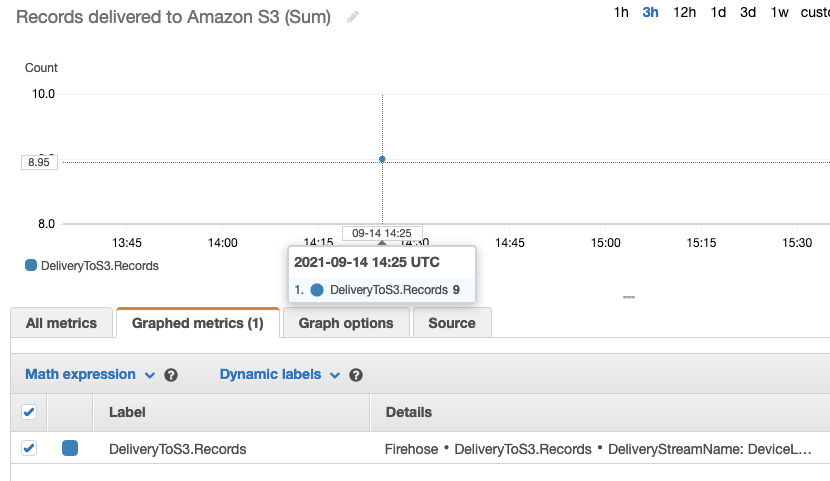 - Choose the Monitoring tab and look for the DeliveryToS3.Records metric.
