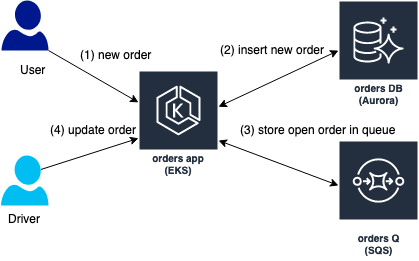 The load simulator mimics a fictitious application ordering system that allows users to place new orders (step 1 and 2 in the diagram) and update the orders throughout the order lifecycle (steps 3 and 4 in the diagram).