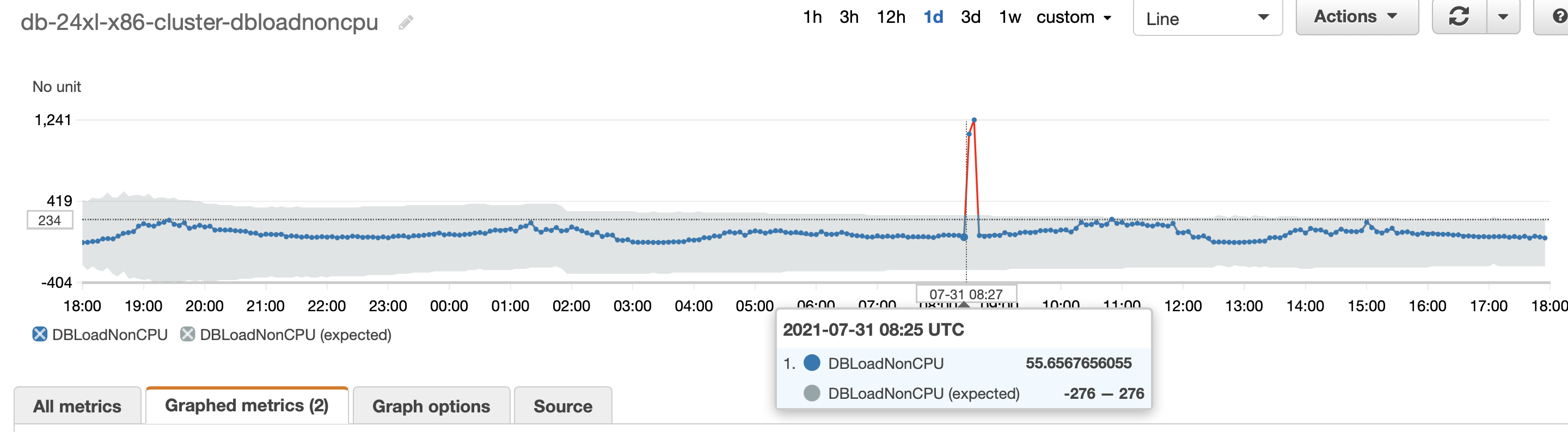 The following screenshot shows a spike in buffer content locks that started at 8:40 UTC, but the anomaly detection algorithm discovered a growing number of DB load on non-CPU at 8:25 UTC.