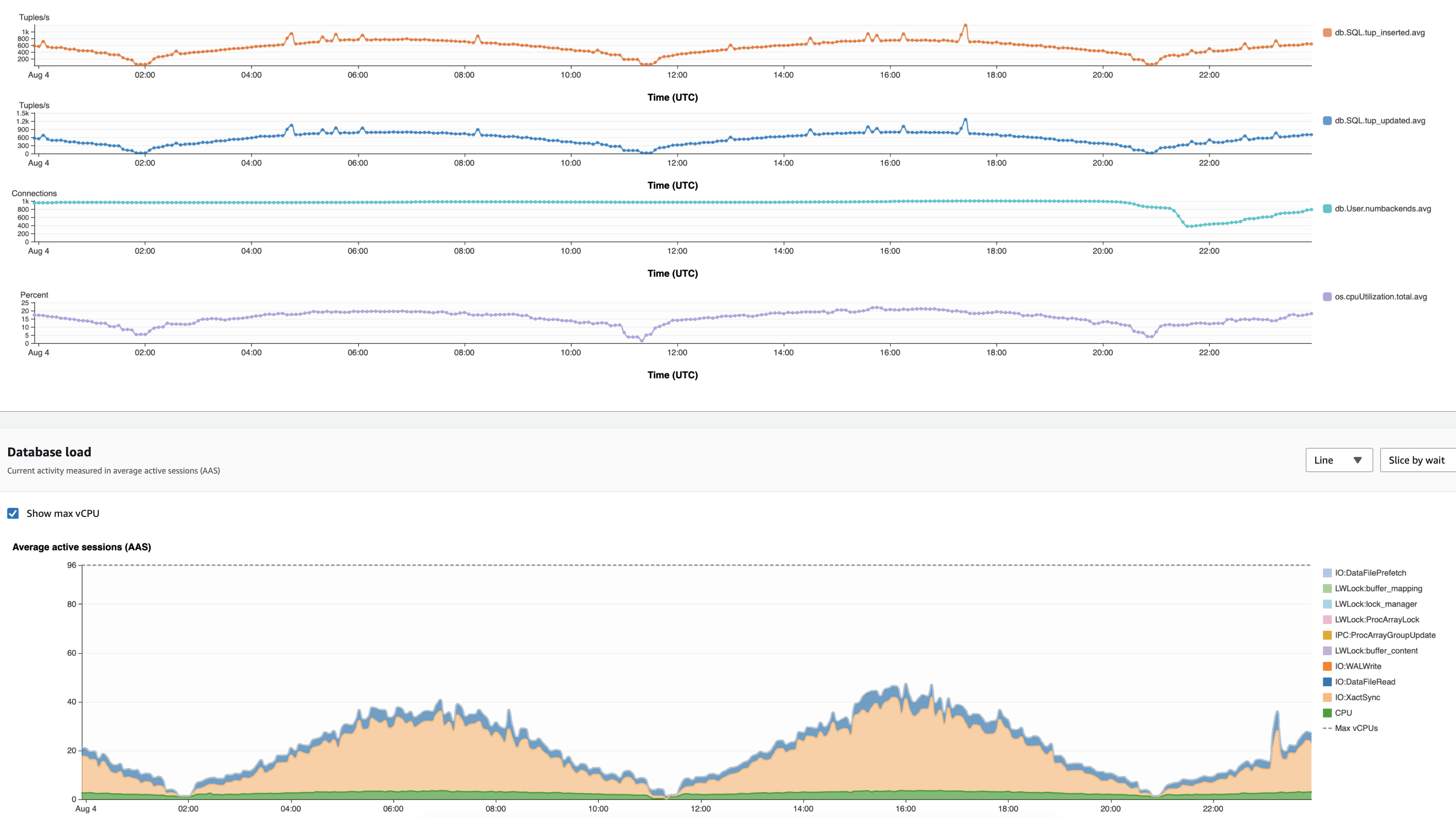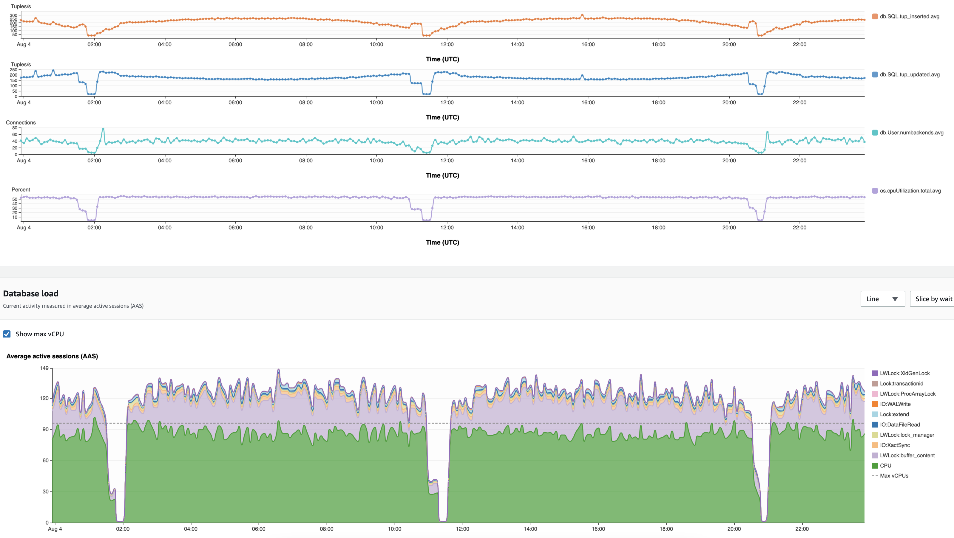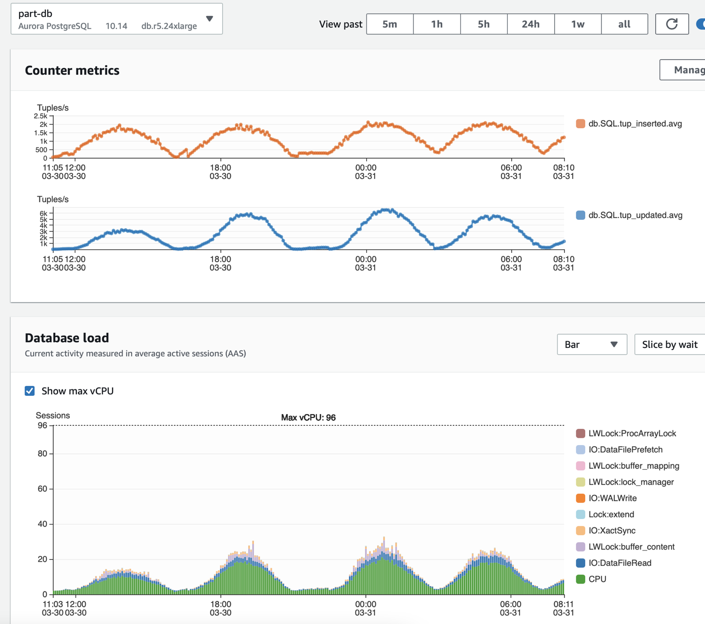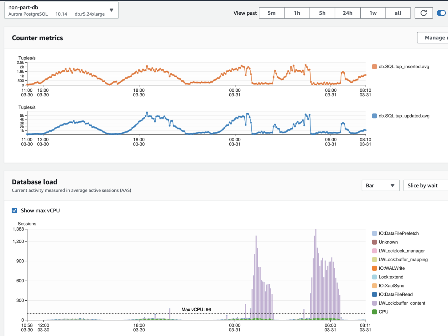 In the following test, we run a load of a positive sine wave of 2,500 inserts and 6,000 updates at peak with 17 TB in two configurations: a partitioned table to 1 TB and a non-partitioned table denoted by part-db and non-part-db, respectively. The non-partitioned database manifested buffer_content LWLocks that impacted the insert and update throughput. You can observe the drops in inserts and updates at 01:00 and 04:00.