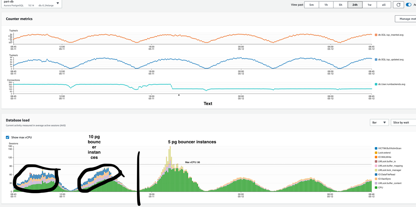 Application platforms offer dynamic connection pools, which define minimum and maximum and dynamically open and close connections per the application demand. We noticed a correlation between a high number of connections to the database, CPU usage, and the number of buffer_contnet LWLocks. For example, we loaded an Aurora PostgreSQL db.r5.24xlarge database with a positive sine wave of 700,000 inserts/second and 500,000 updates/second. We used two configurations: the first with PGBouncer, which limits that maximum of backend connections to 1,000, and a second configuration that connected the application directly to the database and was bounded by the application’s dynamic needs.