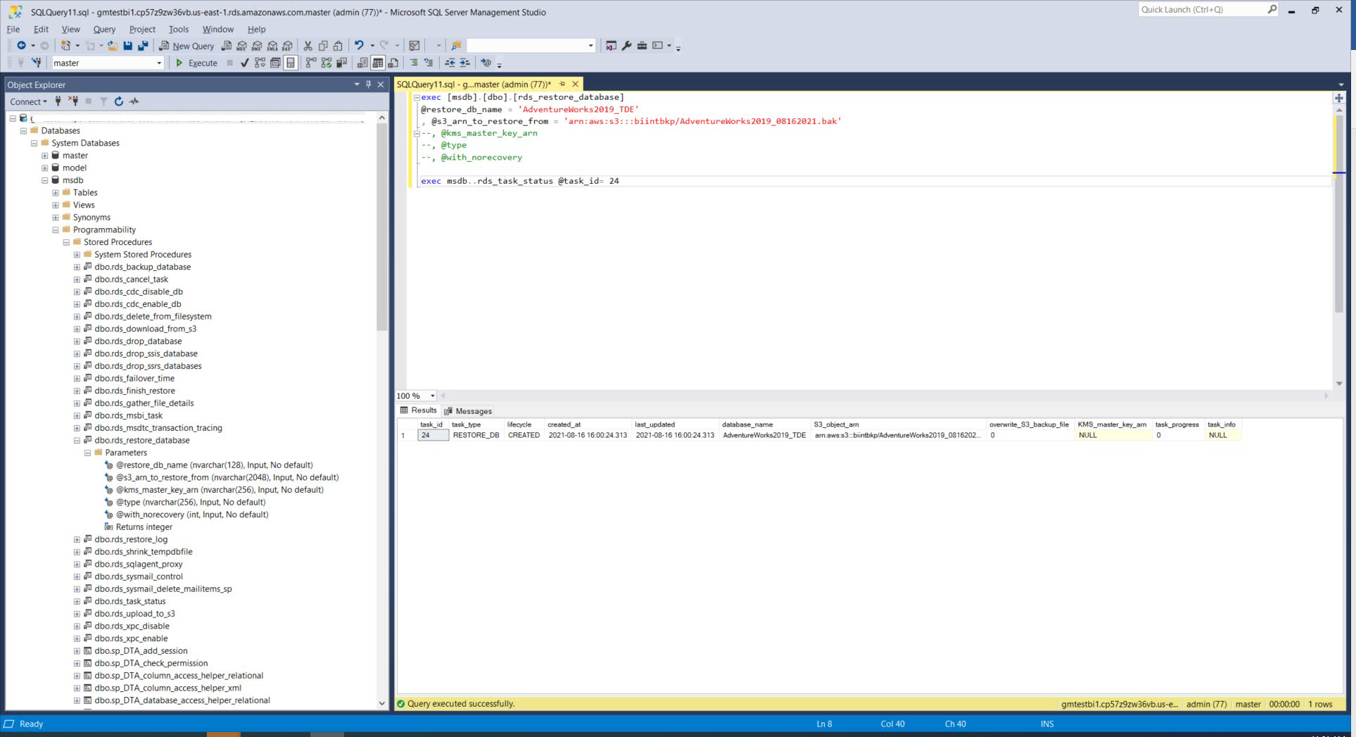 msdb.dbo.rds_restore_database. - Validate the restore status.