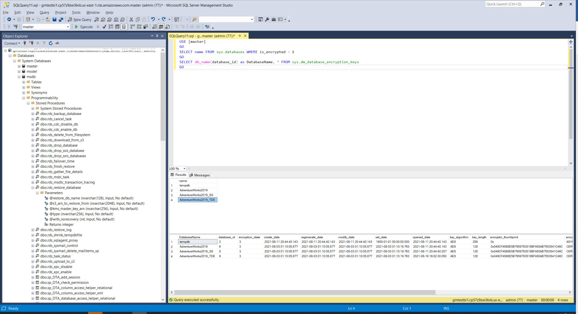 In this section, we demonstrate how to how to back up and restore TDE-enabled database backups on the same instance.