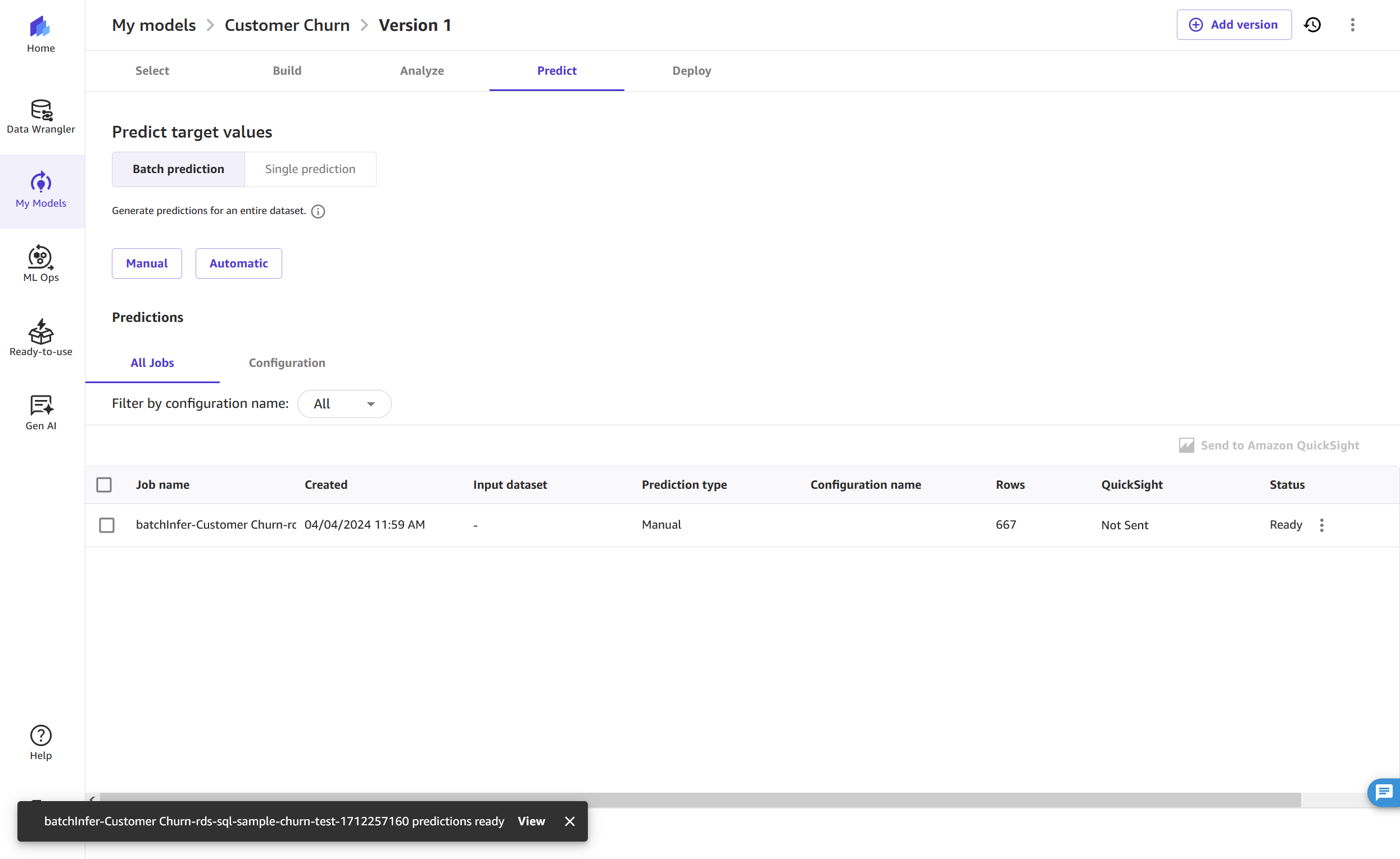 - When the ML model predictions generation process is complete, choose the View link displayed in the pop-up message on the bottom of the screen