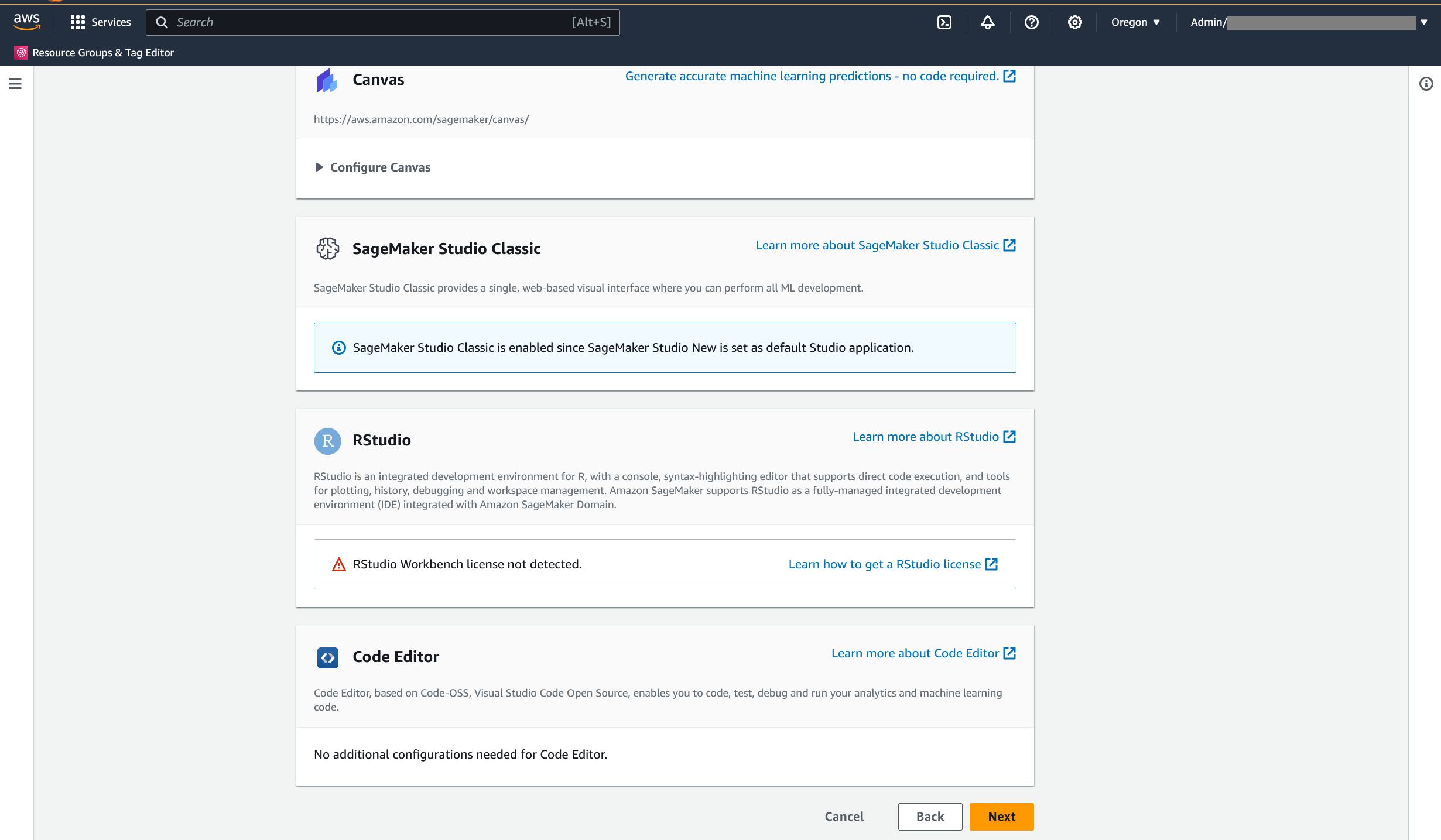 - Validate that the option SageMaker Studio – New is already selected for the SageMaker Studio application.
