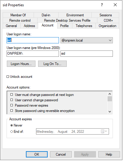 Create a user sid@ONPREM.LOCAL on the on-premises Active Directory. We connect to Amazon RDS for PostgreSQL instance with this user using Kerberos authentication.