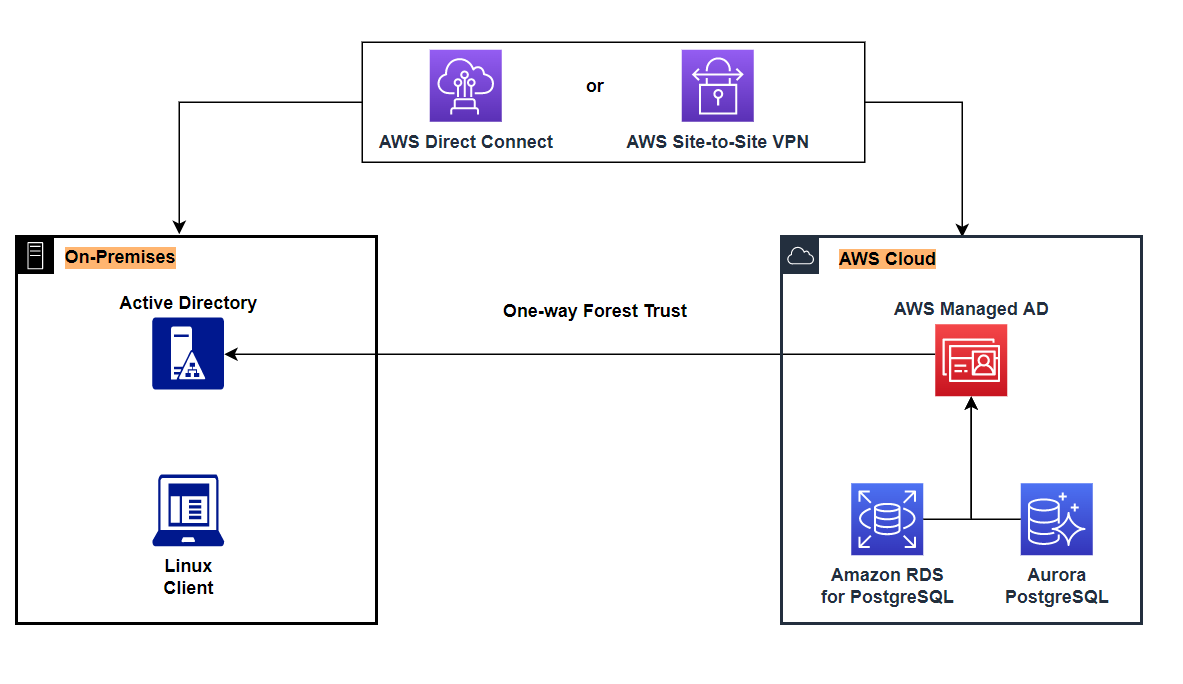 The solution uses Amazon RDS for PostgreSQL joined to AWS Managed Microsoft AD and a Linux client. You can apply the same approach to use Amazon Aurora PostgreSQL-Compatible Edition. To allow users in your on-premises AD domain to access Amazon RDS resources in the AWS managed domain, a forest trust relationship must be established between the two domains. This forest trust relationship provides a way for AWS managed domain to grant access to resources based on the authentication within the on-premises AD domain. In our solution, we establish a one-way forest trust between the on-premises domain and the AWS Managed Microsoft AD. A one-way forest trust only enables users from the on-premises AD to access resources in the AWS managed domain, but not vice versa.