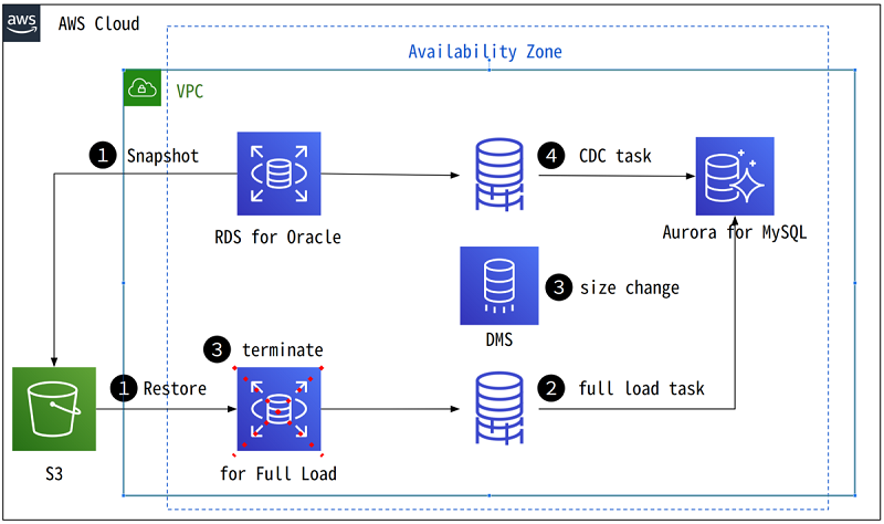 To reduce the time required for a full load, we changed the required infrastructure configuration in AWS from a large instance size to a 4xlarge size during the full load operation. In change data capture (CDC), which is for applying difference, we needed to reduce the running cost by configuring with the minimum instance size. There is a restriction that you cannot change the configuration of an Oracle environment instance at the time of full-load operation. To solve these problems and operate efficiently, we completed the following steps: