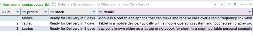 Inserts in the demo_user.product_tbl table consist of the product ID, name, delivery period, and detailed text of the product: