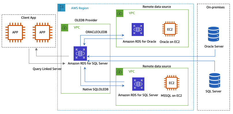 Amazon Relational Database Service (Amazon RDS) for SQL Server now supports the Oracle database engine as an external data source to implement heterogeneous linked server configuration and run distributed queries. With this feature, you can now create a linked server configuration between Amazon RDS for SQL Server and an Oracle database instance running in your network as an OLEDB target. This feature helps customers who want to access data using TSQL from an external Oracle database without application changes.